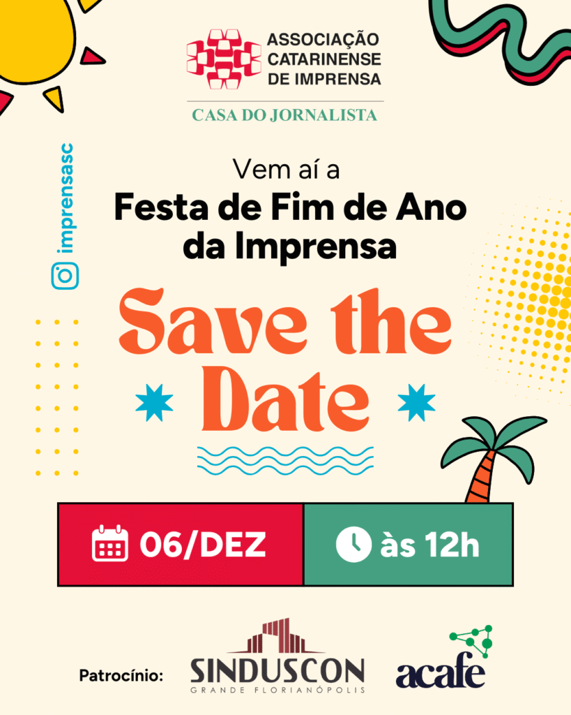 A Associação Catarinense de Imprensa (ACI) convida jornalistas, comunicadores e parceiros para a tradicional Festa de Fim de Ano da Imprensa Catarinense, que será realizada no dia 6 de dezembro, a partir das 12h.